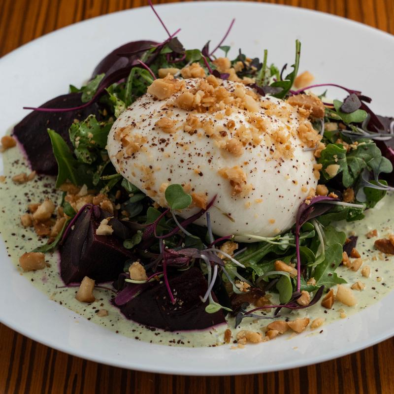 Garlic yogurt sauce, warmed burrata, roasted beets, dill vinaigrette, macadamia nuts, beet micro greens