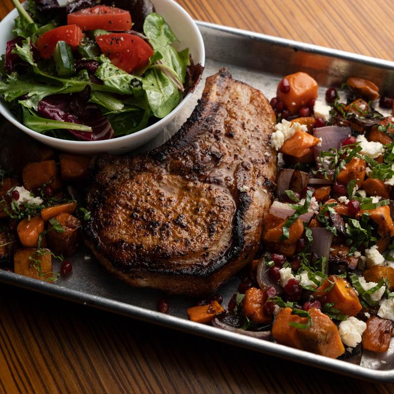 Sweet potato puree, candied nuts, apple cider onion jam, bourbon & brown sugar rub pork chops, side salad